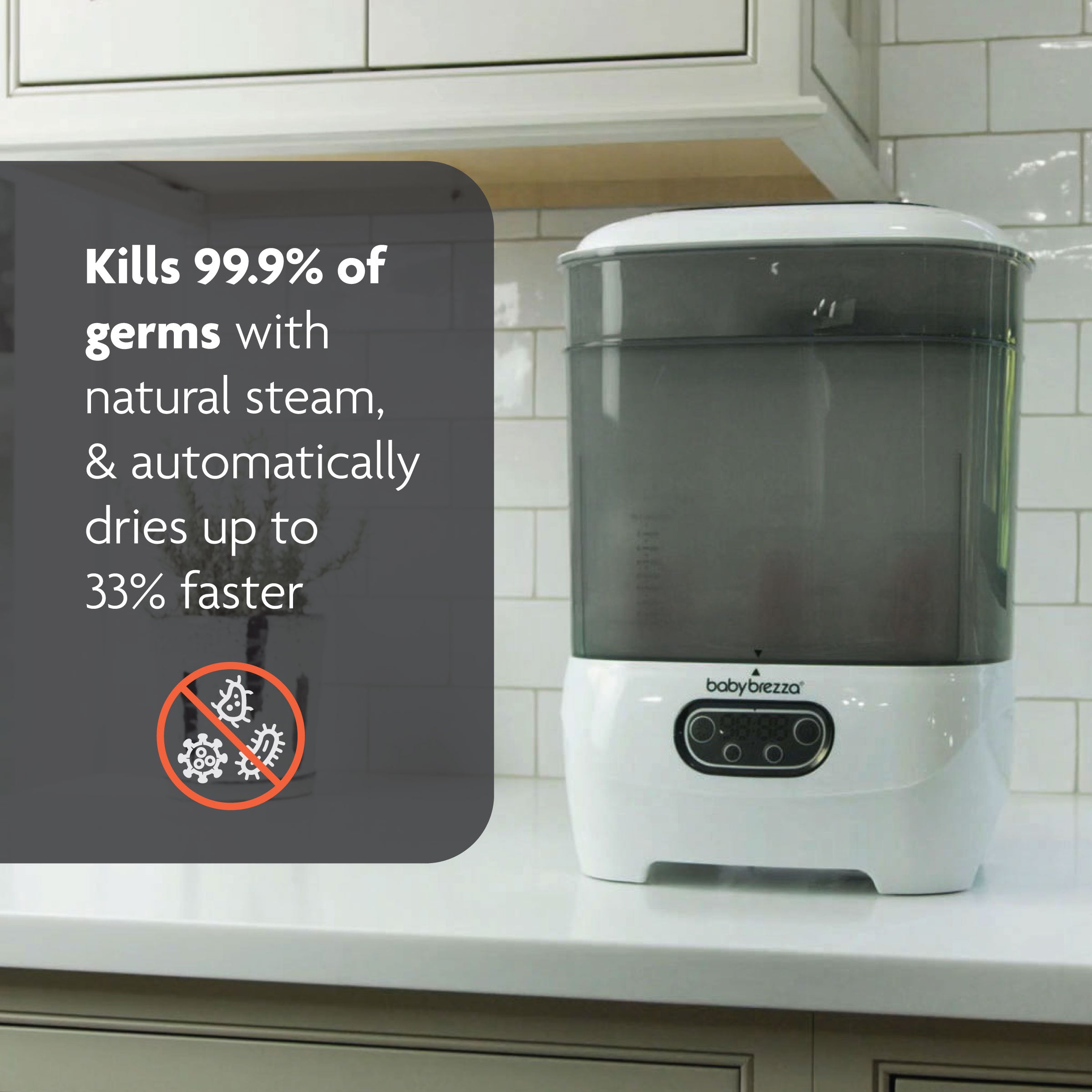 • Kills 99.9% of germs – Steam heat eliminates bacteria. mold. and the yeast that causes thrush
