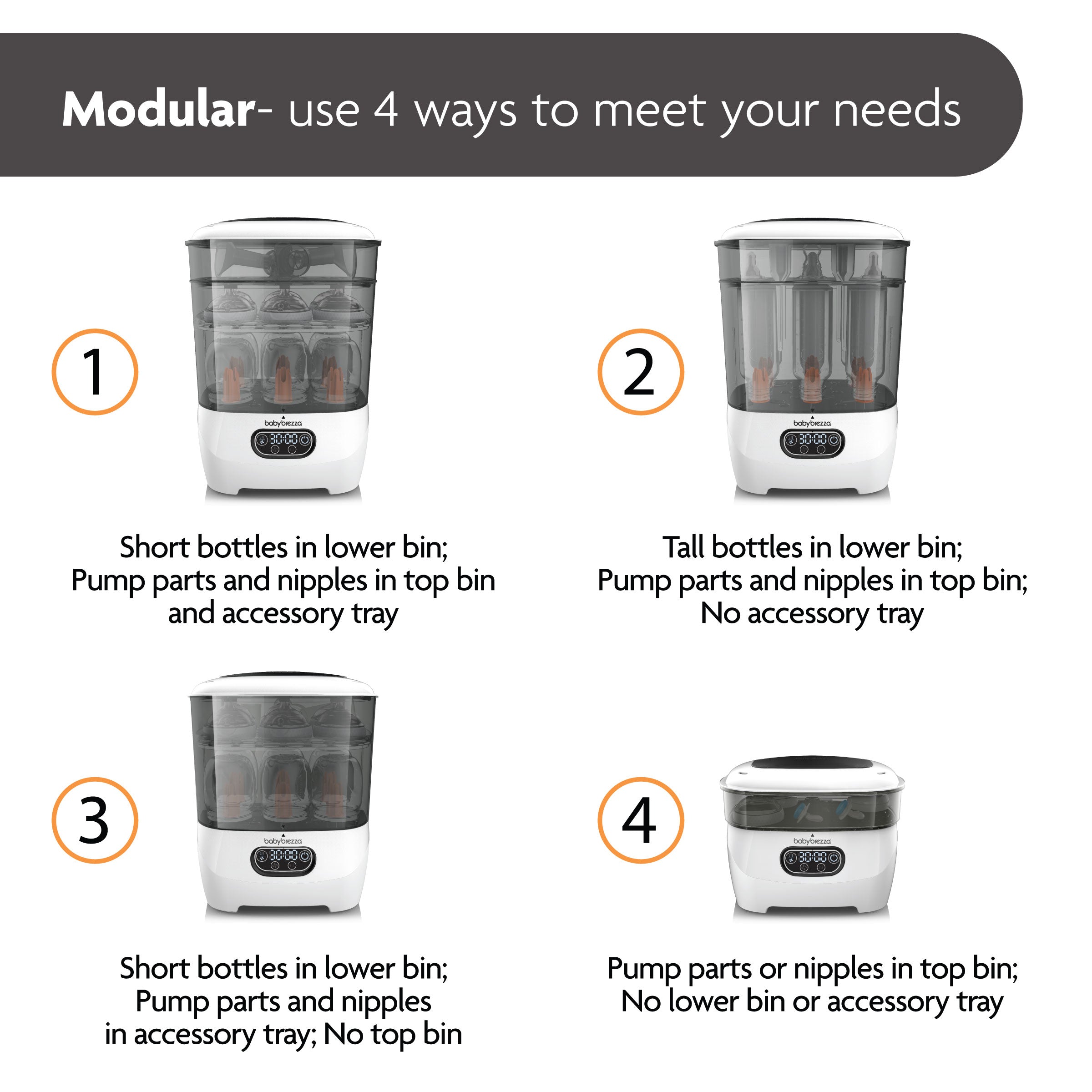 • Largest capacity – Holds 8 bottles (plastic. silicone. and glass). 2 full breast pump sets (including wearables). pacifiers. and accessories from any brand