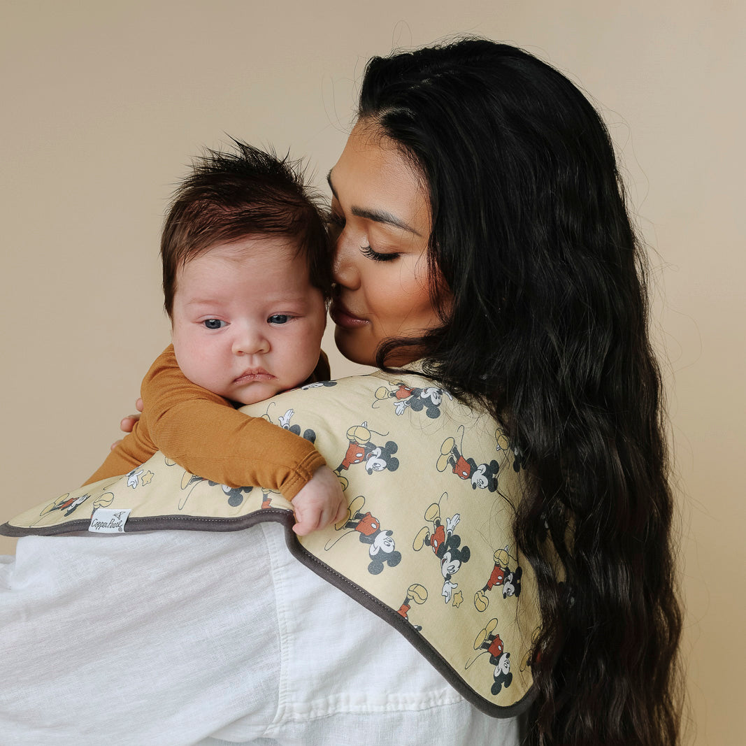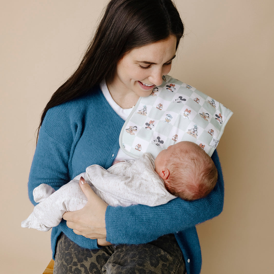 - Our burp cloths are designed with baby’s comfort in mind. That’s why we created them with 100% ultra-soft cotton layers on the front (patterned) and back (plain white). You can feel confident that baby will feel cozy against your shoulder while burping.